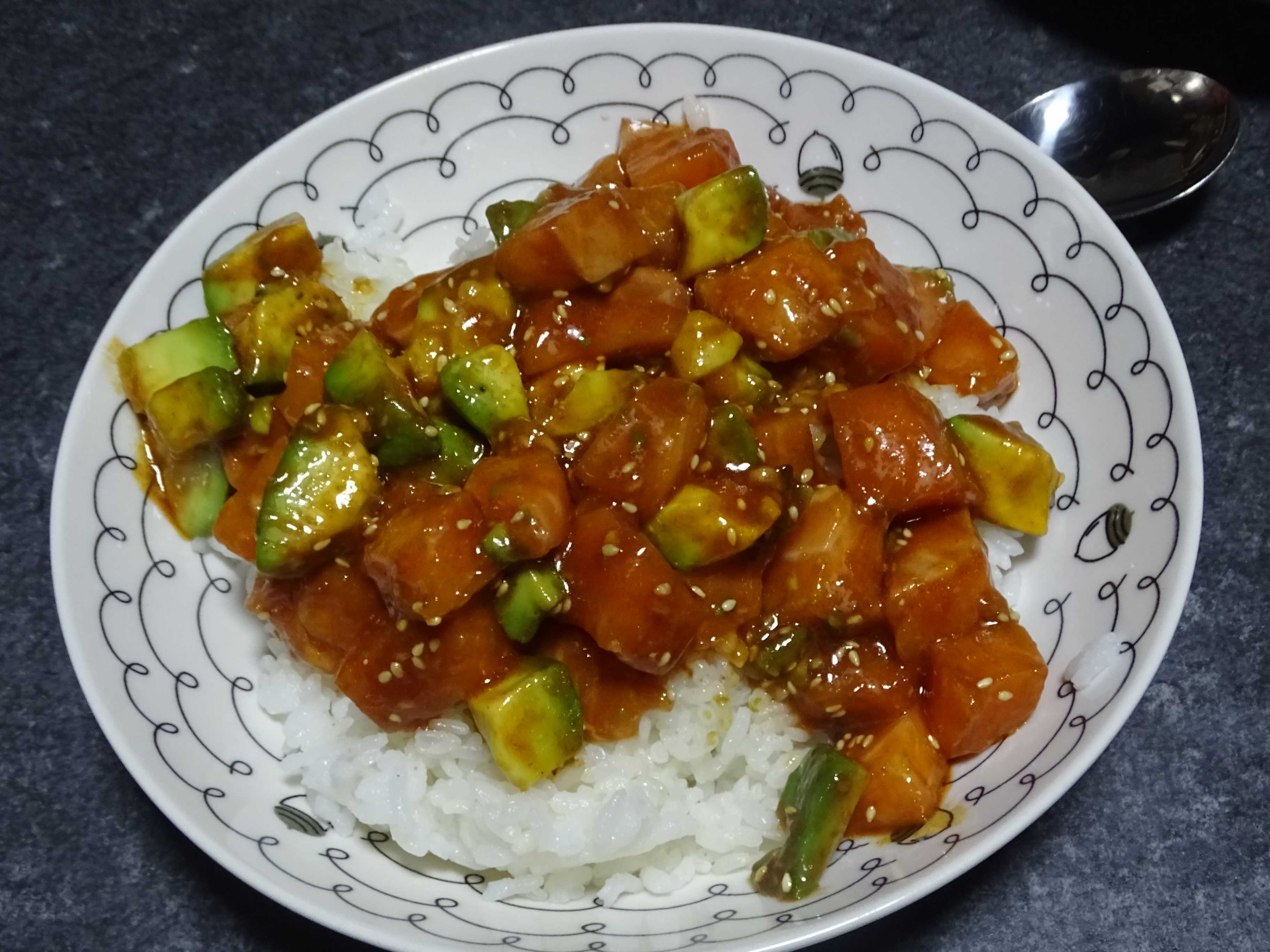 で・・夕飯は・・サーモンとアボカド丼・・です