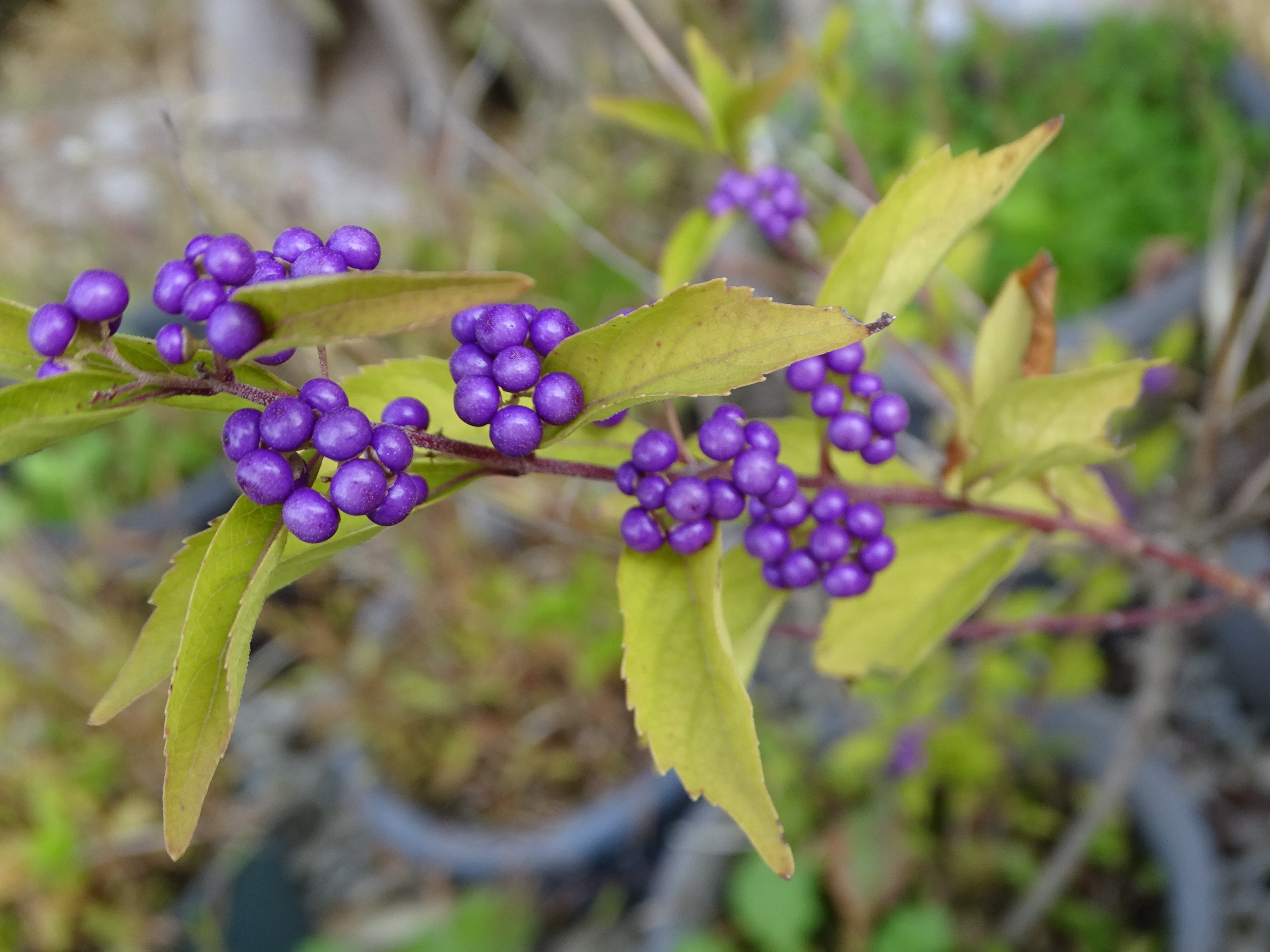 紫々紫(シジムラサキ 斑入り紫式部) は今年花をつけてくれたのですが厚さに負けて