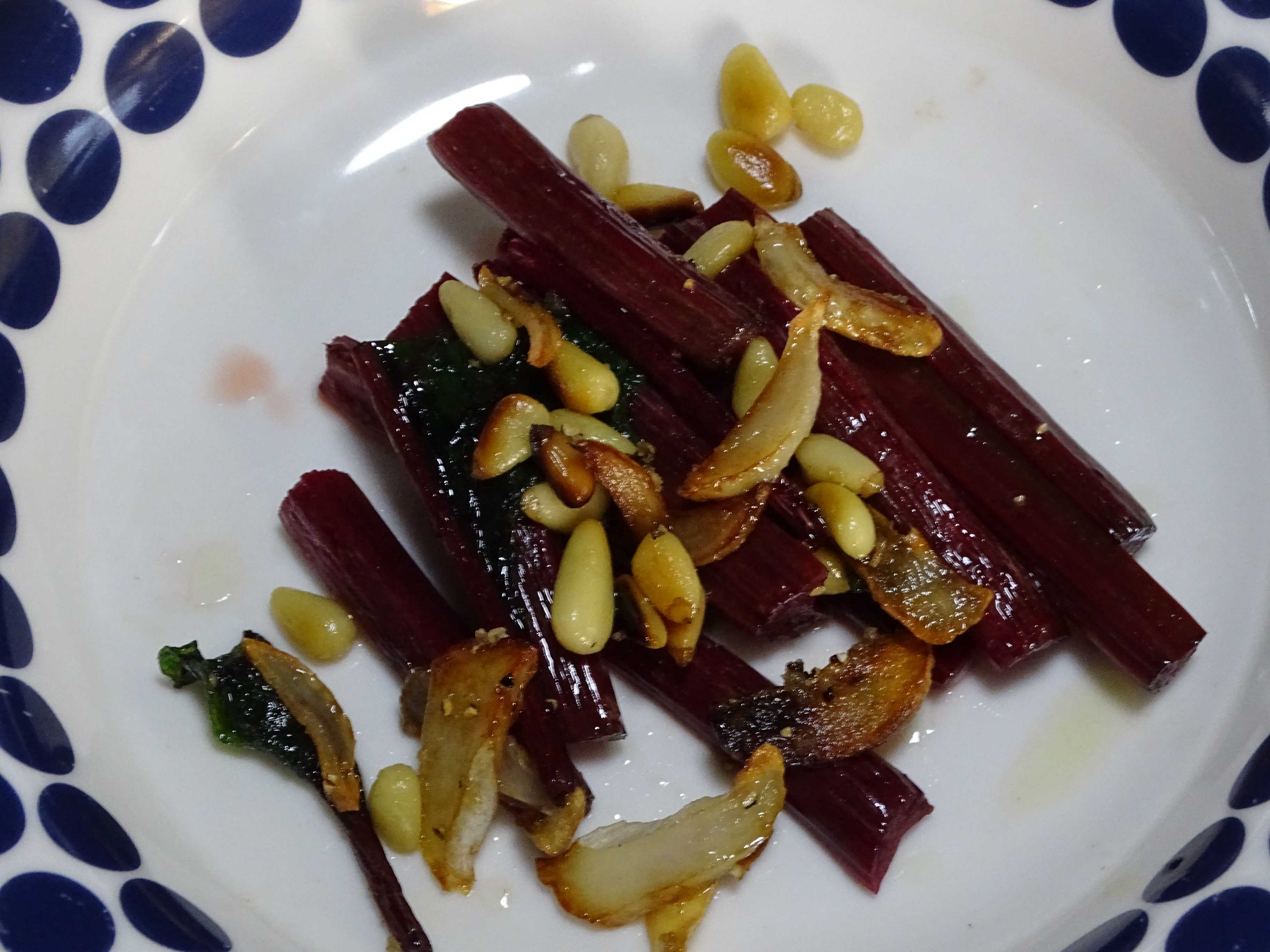 で・・帰宅してから先ずは昨日のビーツの茎を・・大蒜と松の実を使って炒める・・・