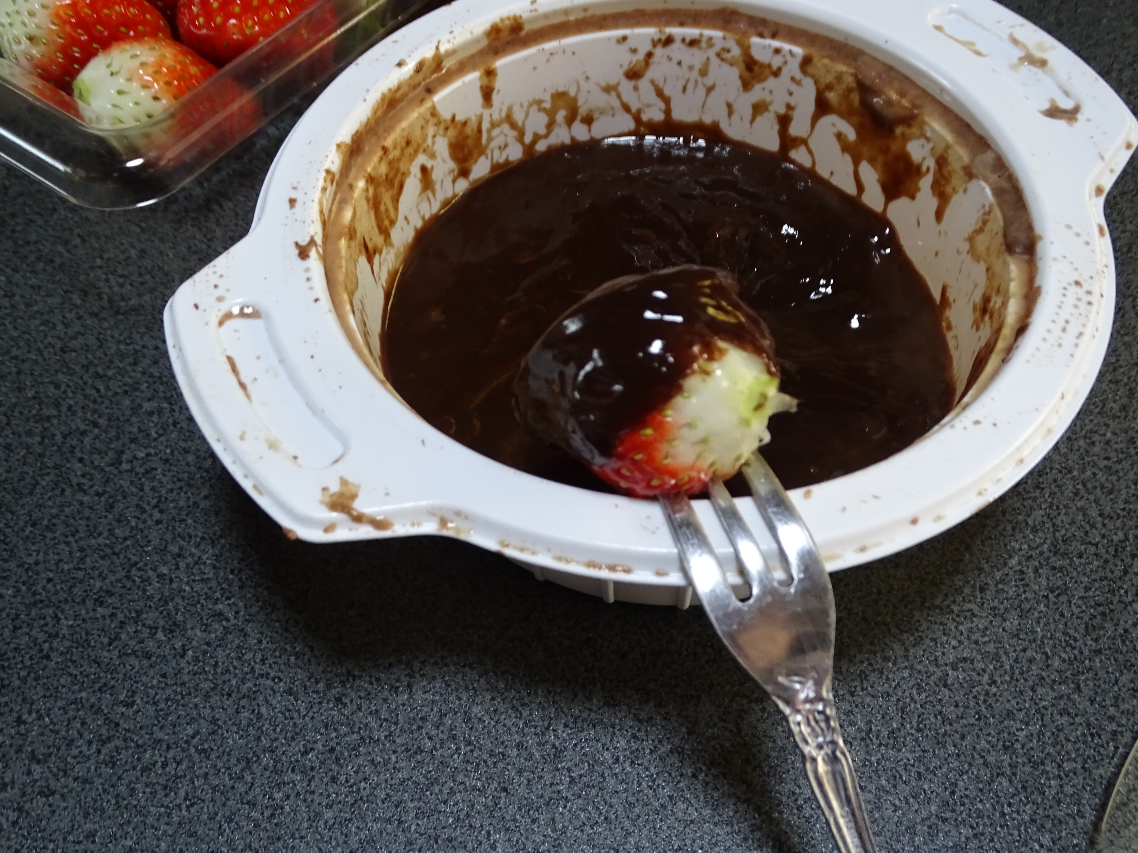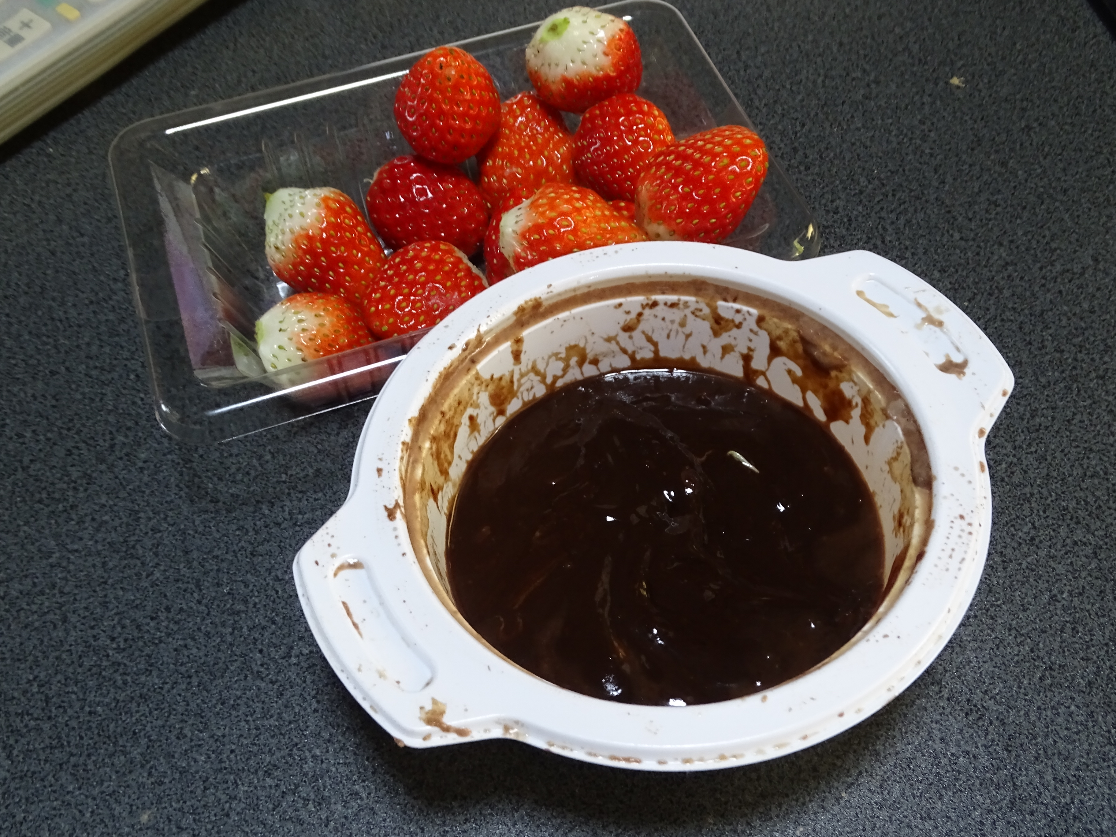 で・・スーパーから・・イチゴ1パック・・・そしでチョコを支持通りにレンジで・・・・
