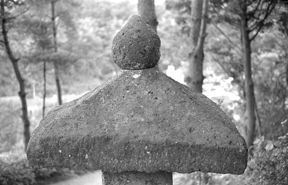 笠は、軒隅下部の高さが不揃いで、傾いているように見える。軒先は少しかぶり、軒裏に幅が不揃いの平行垂木を各辺四本と、隅垂木を彫り出している。軒は、上、下辺とも中央部を高くした起り曲線にし、軒厚も中央部が端より大きくなっている。屋根は、わずかに照らせ上辺を軒幅にくらべてかなり小さくしぼり、直接、宝珠を受けている。