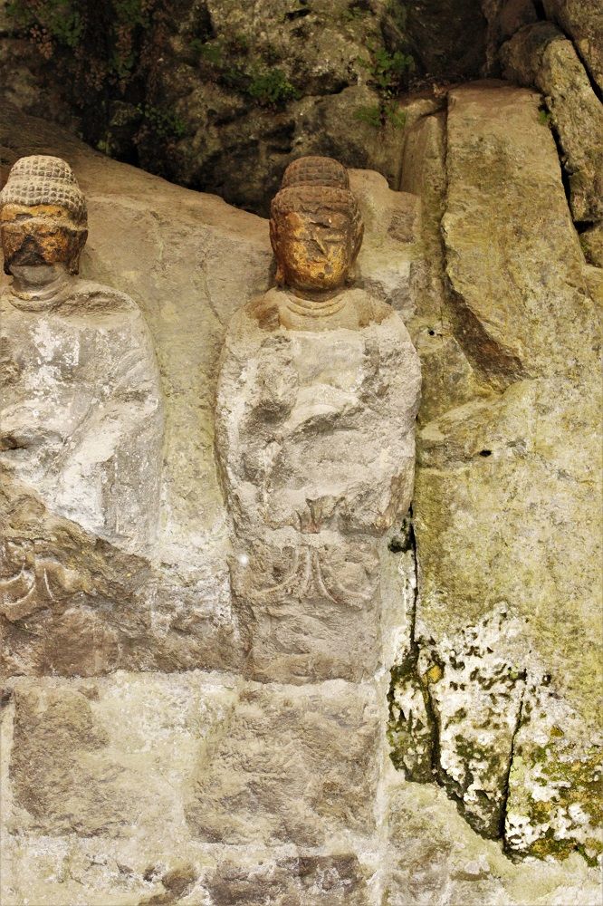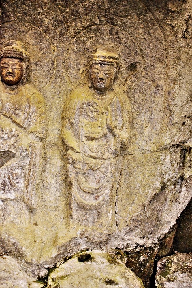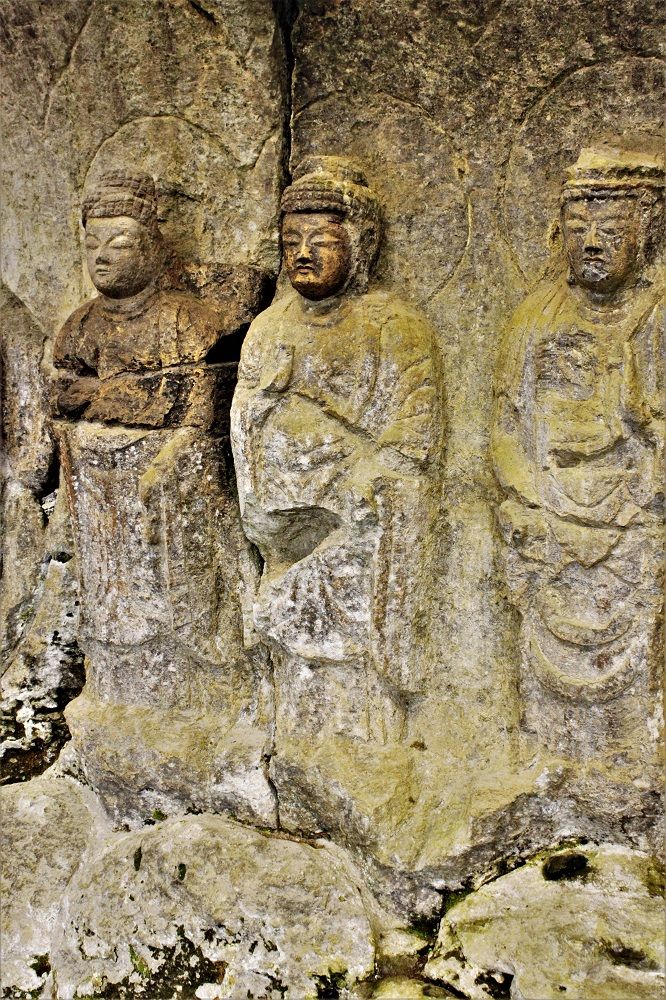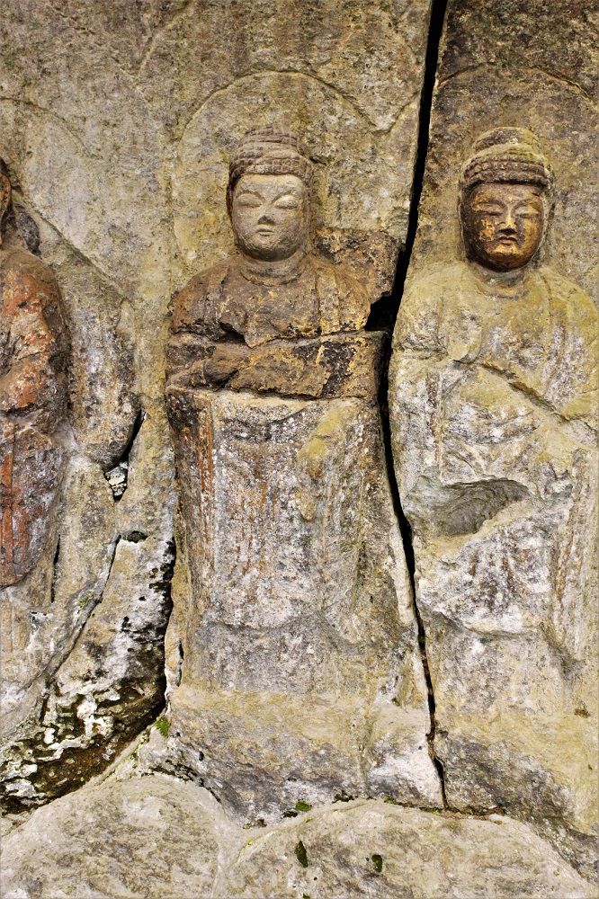 裳懸座上、欠損している部分は多いが、像容は剥離していたのを集めて、修復してある。中尊の光背には朱や墨で円相を書いて中に梵字が書かれていたようだというが、肉眼では確認できない。