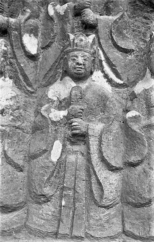 地蔵像の両側に十王立像が並ぶ。胸前に両手で笏を持ち、道服を着てそれぞれに意匠を変えた冠を付ける。