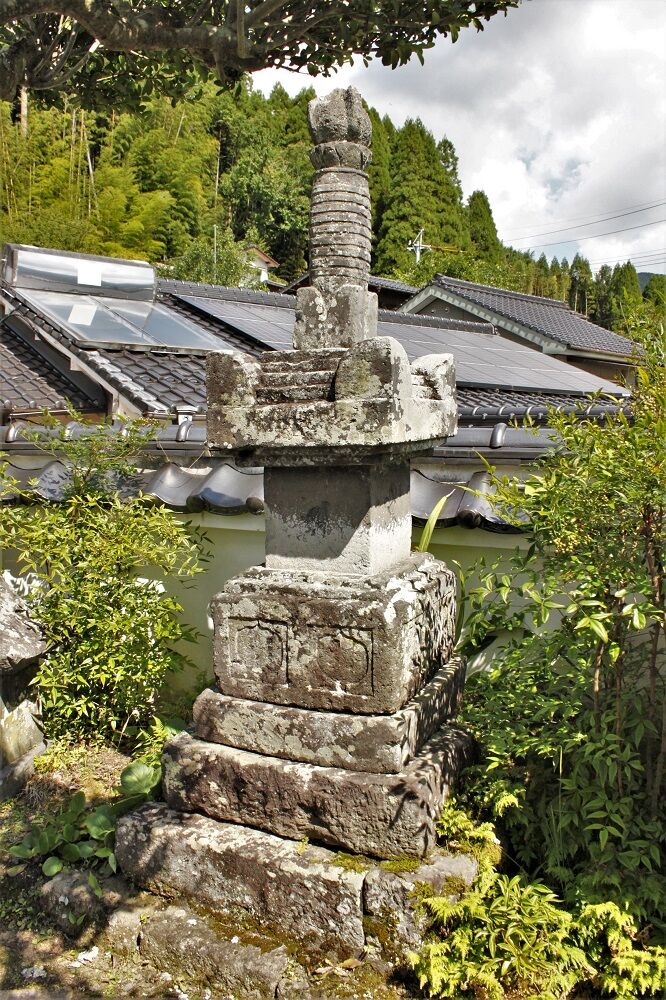 塔は、規模、塔身の上下を基礎と笠の枘穴に大入れにするところ、軒下2段の薄い造り出し、相輪、笠隅飾1弧、請花部隅飾1弧など、石大工一乗作の元大原神社宝篋印塔(貞和三年、1347、日田市)を基本にした作りである。基礎側面の輪郭内格狭間を1個から2個に増やし、塔身四方種子は、面に対して大分小さくなり、四仏の内「バン」を「サ」に変え、笠隅飾の延べ作りを軒と区分した造りに変え、隅飾側面の円相を無地にするなど異なった所もある。また、基礎側面、基礎や笠の各段造り出しの直線加工部分に歪みが多く、各部、各段左右の高さにも不均一なところがある。笠隅飾と相輪請花部の隅飾も4方で大きさが少し異なった所が見られる。