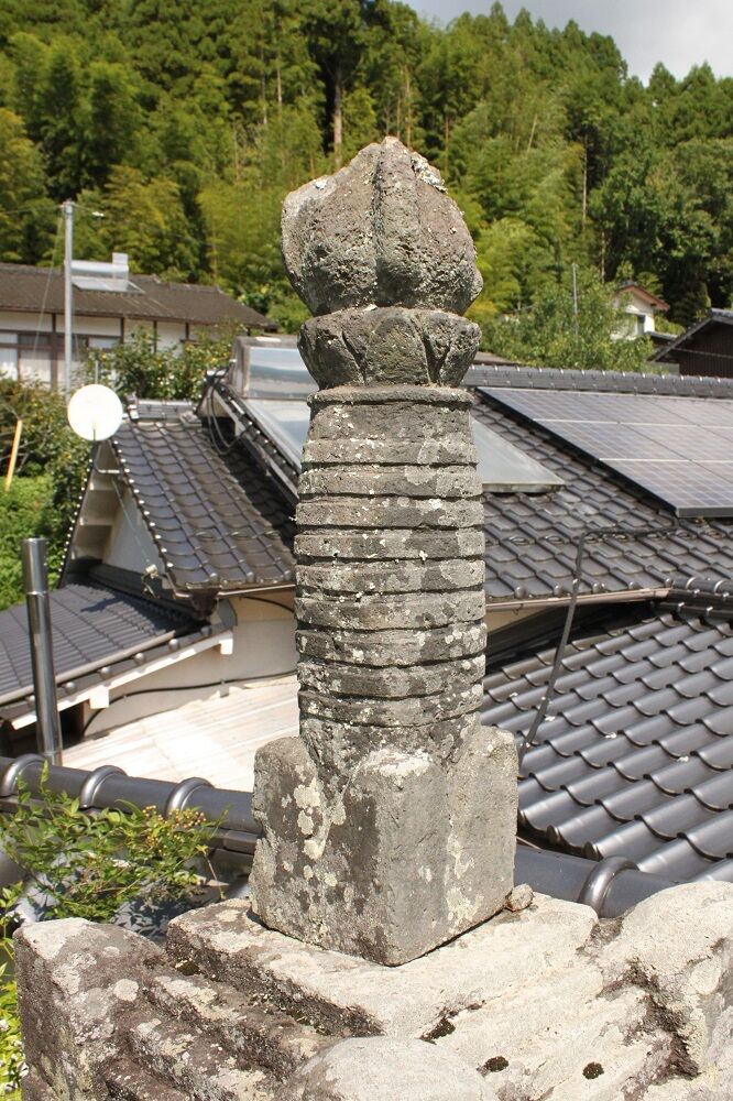 相輪は、下から請花部隅飾、九輪、紐帯、請花、火炎宝珠で、先行する元大原神社宝篋印塔相輪と同じ構成である。相輪には、露盤、伏鉢は無い。相輪下部は断面四角で九州様式の請花部になっている。笠隅飾1弧と同じく、それより細身の隅飾1弧で、各面や同じ面の左右の幅や上部曲線の形などにばらつきがある。側面無地、下部幅19.0センチ、上部幅18.5センチで上部がわずかに窄まっている。請花部のほぼ真ん中、中央に近い高さで左右を合せる。刹9輪の断面は、大分角張った丸で、各輪の幅や輪郭が一定せず、彫り出しも薄い。4輪目を最大径に膨らませて上下を絞った形にする。9輪上に3.5センチ程間を開け、上部につなぐ。紐帯は、薄い側面の上面をすぼめて、請花下部に繋ぐが、平行にならず波打っている。請花は、側面に単弁8葉を線刻し、間弁を入れる。蓮弁の形は、抑揚が無く形式的な形になっている。上部最大径は、18.5センチで請花部上辺の幅と同じにする。その上の火炎宝珠は、宝珠に厚く張り付いた四方の火炎や火炎頂部に破損がある。火炎表面は、無地仕上げにする。