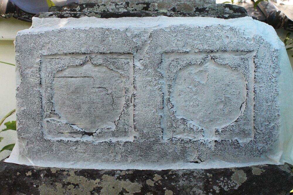笠下面に、塔身上部を大入れにする方形枘穴を幅34.0センチ深さ約2.0センチ彫り込む。