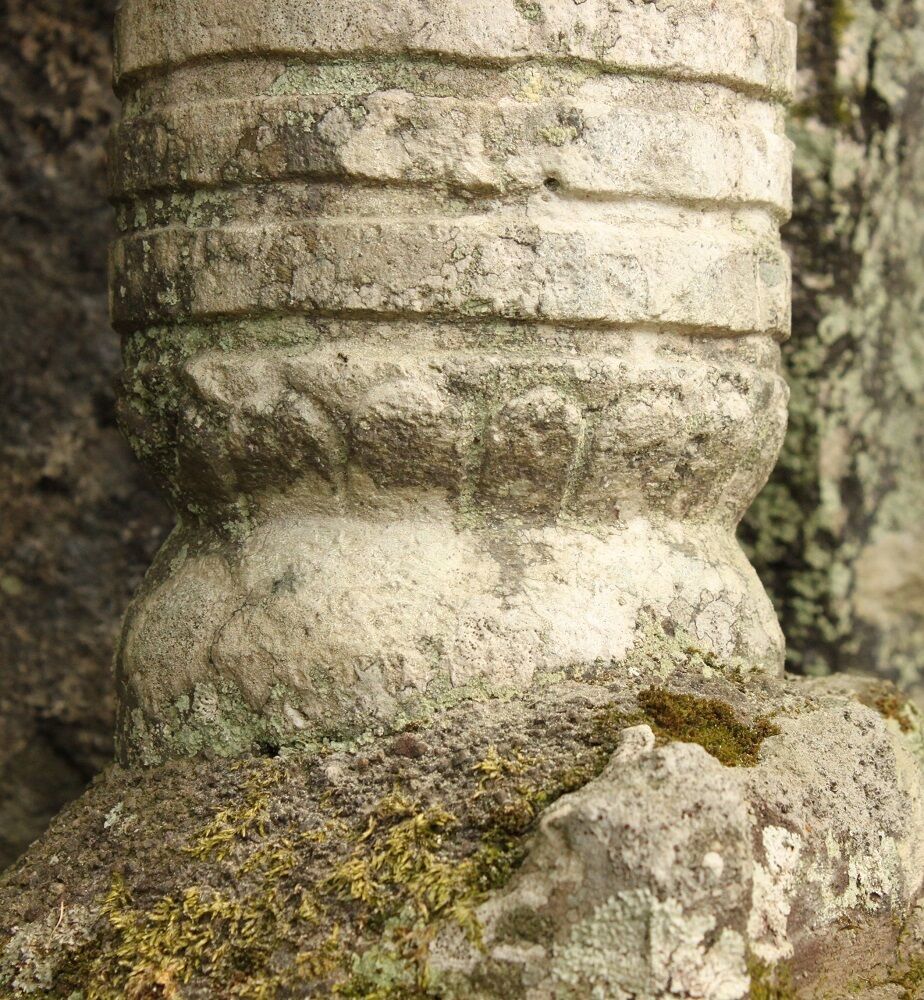 葉を薄肉彫する。宝珠は、上部の曲線は通常の形だが、下部は切ったように低くして絞る形にしている。反花と宝珠の間は、紐帯とも見える低い頸を作ってつなぐ。