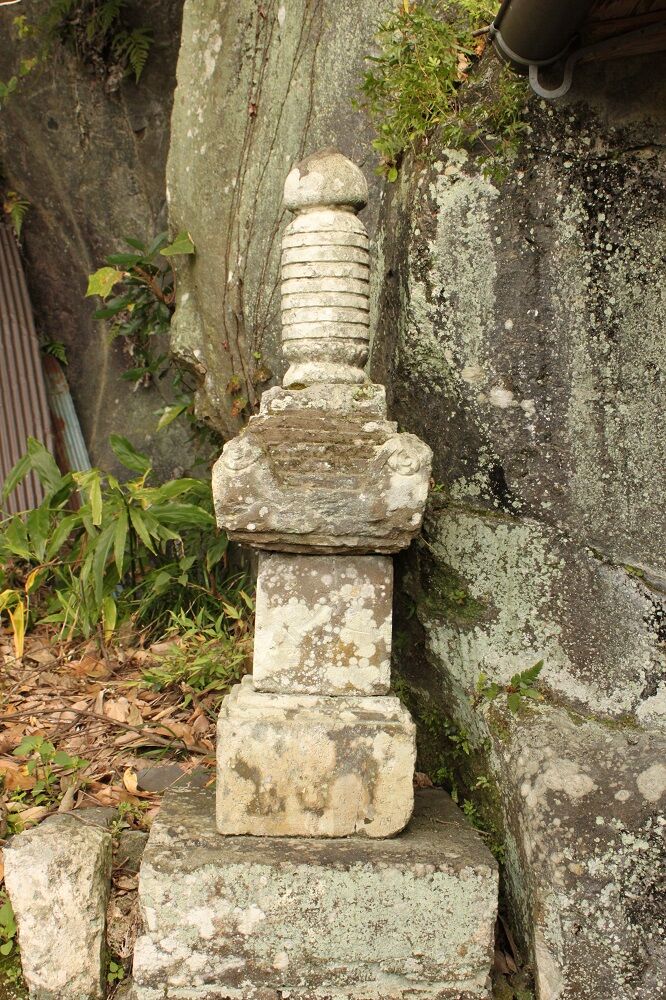『大分の石造美術』201Pには「三宮町山下集会所に宝篋印塔がある。」と記載されている。実際には、その山下集会所から更に150メートル程集落に入った、道路から1段上を開いて設けられた大師堂の狭い境内の岩壁に接して建っている。大師堂は、岩壁に仏龕2個を並べて彫り込み、中に、近世末期以降造立と思える石造丸彫不動明王立像、石造丸彫弘法大師坐像を安置し、岩壁に接して小堂を建ててある。三宮町は旧町名で、現在の地番には無い。