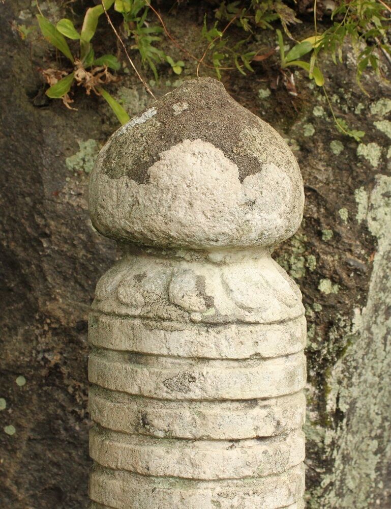 相輪は、上下同じ径の太い円柱を使って、下から伏鉢、請花、7輪、反花、宝珠の構成で彫り出す。下部の伏鉢が貧弱に見え、特に7輪も同径にしているため、安定感を欠いて見える。伏鉢は、下から1.5センチ程までは立気味で、上部の曲面を請花下部につなぐ。請花は、上辺から0.5センチ開けて、単弁16葉を薄肉にする。単弁の大きさや形は、あまり揃っていない。輪は、7輪、区分は明瞭だが、彫り込みは浅い。反花は、請花を逆にした同様の作りで、それより大きくした単弁11
