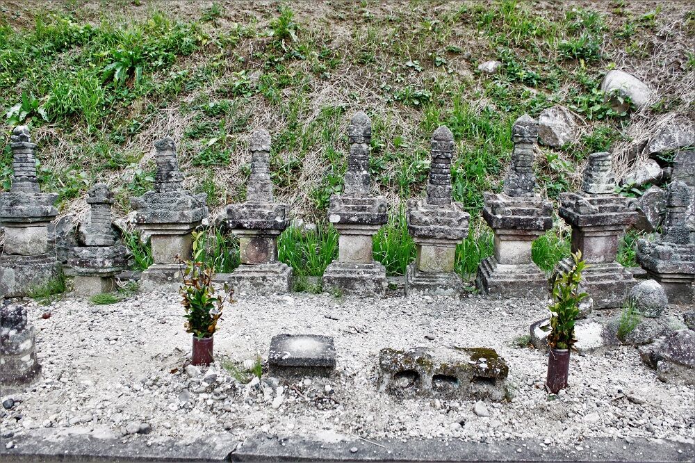 石塔群は、宝篋印塔笠が20基分、相輪23個、五輪塔のものと思われる石塔笠火輪3個、風空輪6個を数える。これらは、昭和45年、ミカン畑開墾中に、現在地の直ぐ下の土中から掘り出されたもので、キリスト教信者の他宗教弾圧により、破壊され、埋められたものと思われる。
