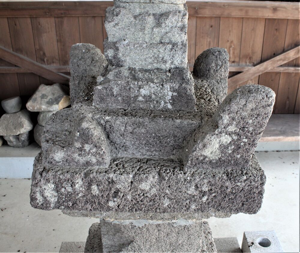 笠は下2段、上3段。上1段は、隅飾の茨の位置に合わせたためか、軒厚と同じ高さに厚く造る。3段目は薄く、露盤を意識した様な造りになっている。