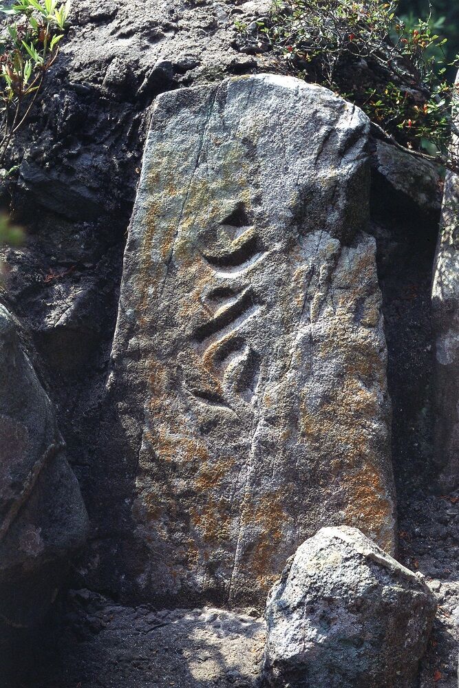 薬師堂西側の脇に設けられた石碑の基壇の側面に、セメントで基部と背面を埋め込まれている。少し先細り縦長長方形の碑面中央に、明瞭な書体で梵字「ウン」を刷毛書で浅く薬研彫する。右側面や背面はセメントに埋まっている。「ウン」は「ウーン」とも読め、どちらか決め難いが、ここでは「ウン」とした。種子「ウン、ウーン」は、如来、仏頂、菩薩、明王など該当する尊名が多くあり、造立者が何尊を意図したか不明であるが、参考文献の「種子抄」に「薬師如来(覚禅抄)」との記述があり、薬師如来種子の可能性も考えられる。