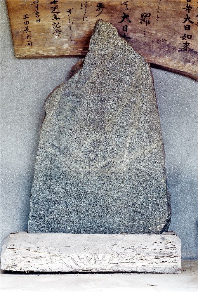 minor-latin"> 板状上細りの自然石の表面を整え、中央に梵字「バン」「アーク」2字を刷毛書、浅い薬研彫で縦に重ねて配置する。書体は、明瞭で整っている。その梵字を囲むように、線刻で下部に輪郭だけの3弁の蓮座、その上に続けて、押しつぶれた円光を2重に重ね、更にその上に先を尖らせた宝珠形を加えた3重光背を作る。蓮弁、光背の線刻は、膨らんで、力強さは見られない。