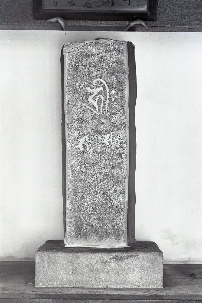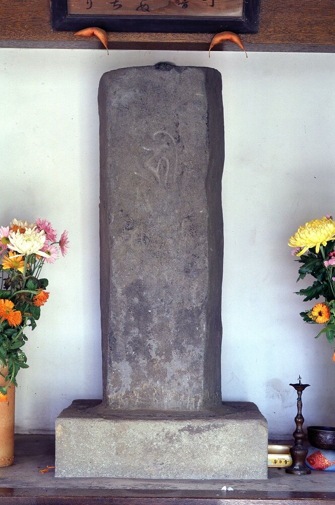 不整六角形柱状自然石の表裏を磨いて、梵字と紀年銘を刻む。