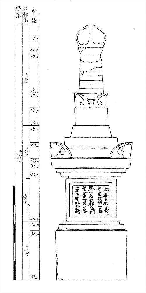 計測により、基礎と塔身は、別塔の積み重ね、塔身と笠も別塔の積み重ねであることが確認できた。基礎と笠は、基礎上部幅より笠下部幅が2.0センチ大きい。基礎は、比高が高い所から、室町時代後期のものではないかと思われる。