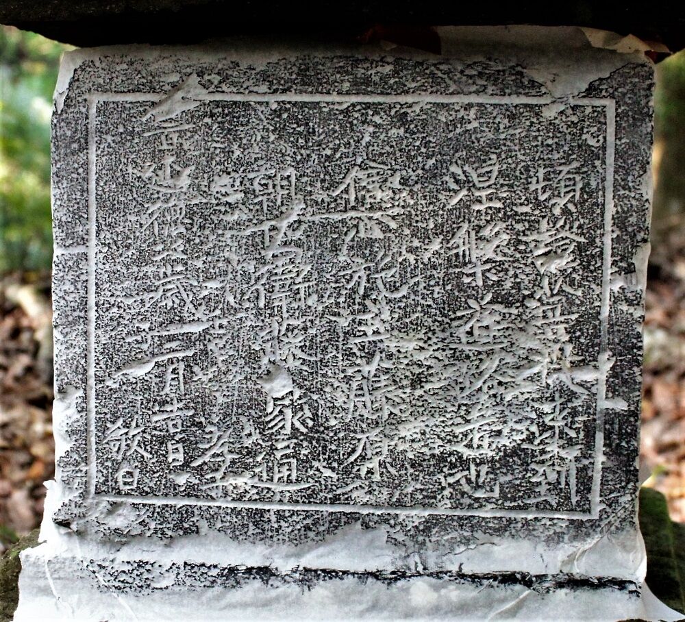 この銘によって、室町時代中期の半ば過ぎの延徳四年(1492)に造立された宝篋印塔塔身であることが確認できる。塔身上部には、幅広の角枘を作り出す。上に乗る笠下面には枘を入れる枘穴の加工が無いため、露出して重ねられており、塔身と笠は、別塔の部品による組み合わせとわかる。