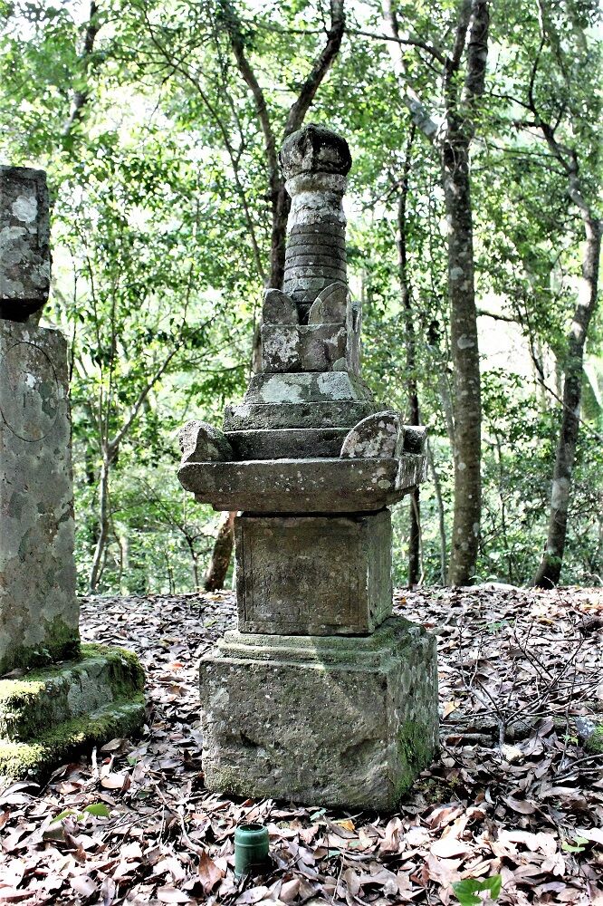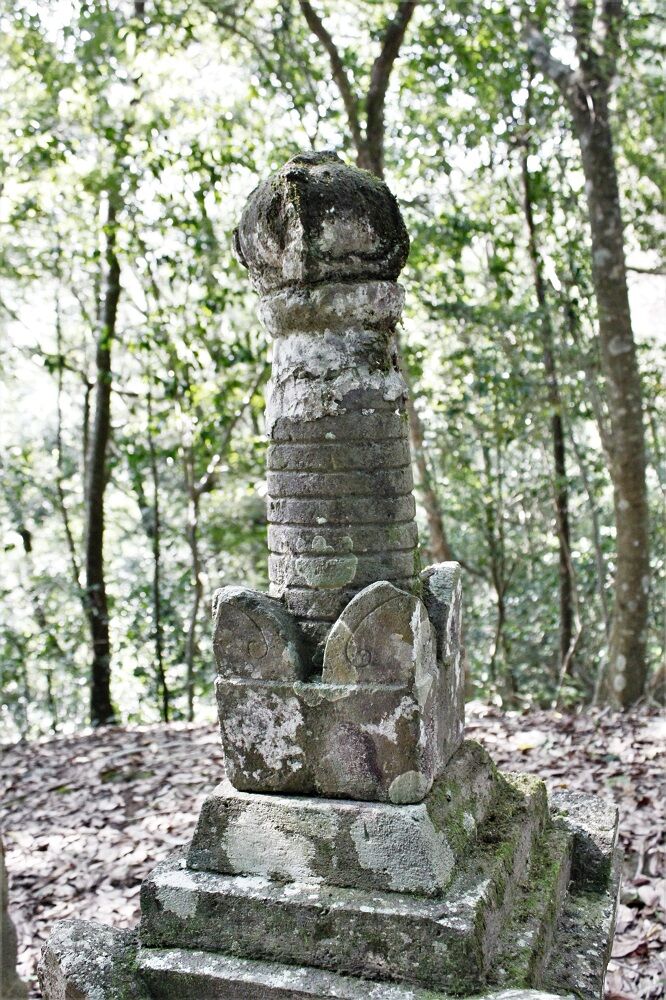 松尾の集落の外れ、県道688号線を北へ向かう山道の入口左側、丘陵突端の小丘頂上に整地された1区画が有り、宝篋印塔残欠、宝篋印塔塔身、六地蔵残欠などの石塔残欠群が並んでいる。その内、現状最大の石塔である。