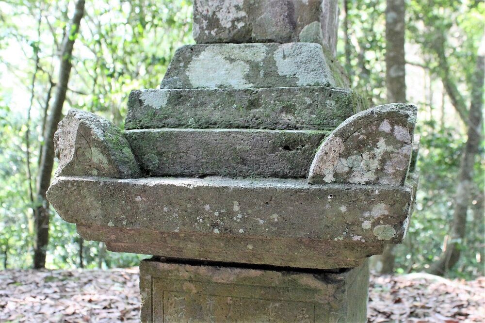 相輪は、露盤、請花部、9輪、請花、四方火炎宝珠を1石で作る。露盤は、背を高くして下部より上部を少し大きく逆台形にする。請花部は、断面四角の九州様式請花部に作り、1個を欠失する。隅飾は、1弧、少し外に開き、隅の立ち上がりは軽い曲線で起りを付ける。側面は、上部から輪郭を付けたように伸ばした蕨手文を線刻する。下辺幅より背を高くしている以外は、笠隅飾と同様の作りである。9輪は、太めの線刻で区分する。8輪の所で折れたのを接着して復元してあり、9輪目は確認できない。請花は、浅鉢状に上拡がりながら小さ目の作りで、側面の3分の1程は接着剤が覆っているが、残りの部分から彫刻は無いことが確認できる。四方火炎宝珠は、最大径を請花径より2.5センチ大きく作る。宝珠に火焔を張り付けているが、火焔は、大分傷んで欠けている所が多い。下部に丸枘を作り出す。笠上面の枘穴とよく合っている。