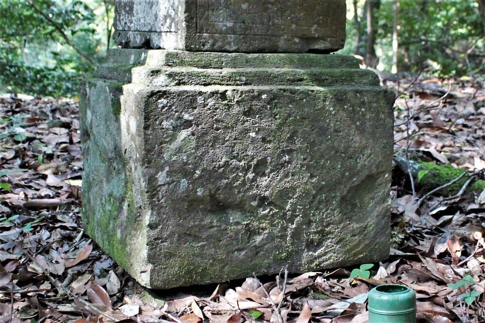 基礎は、上に2段を作り出す。側面が高く、その分、比高が高くなっている。基礎側面は、下部より上部幅をわずかに大きく逆台形にする。また、側面は、大分粗い仕上げになっている。これらから、室町時代後期に入ってからのものではないかと思われる。上面には、塔身を受ける浅い枘穴を彫り込む。現在、上に乗っている塔身下部幅よりも幅は小さいので、基礎と塔身は別塔の部品を重ねていると考えられる。