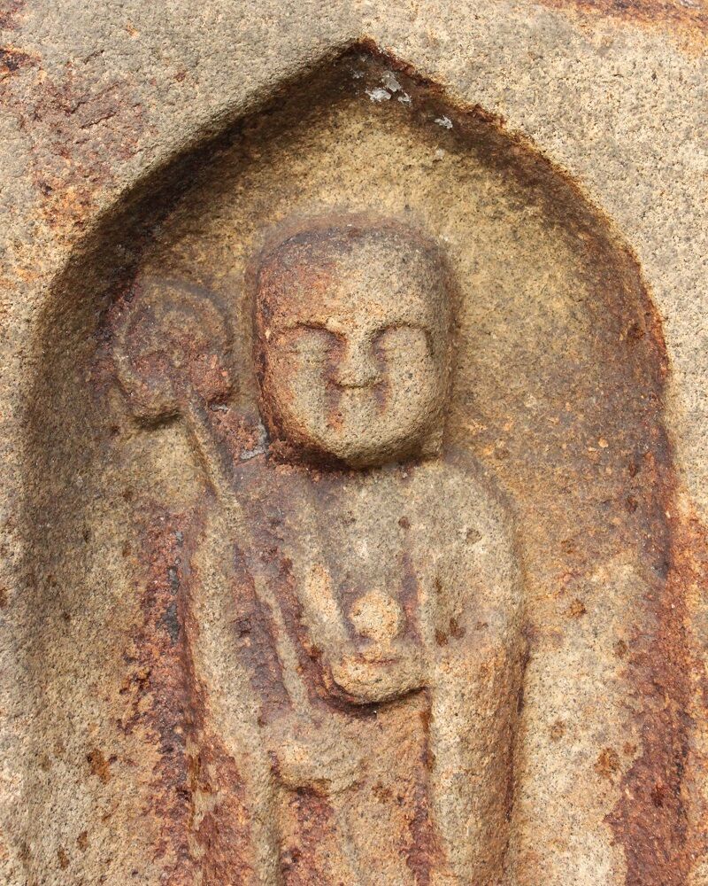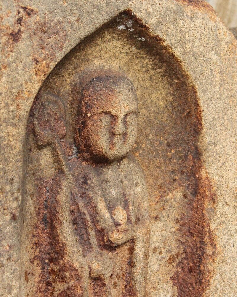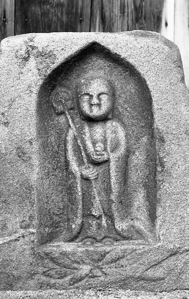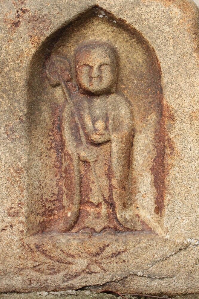 上部を少し窄めた方形に近い石の表面に舟形光背型龕を彫り込み、中に右手錫杖、左掌宝珠の地蔵菩薩立像を半肉彫りする。像下部に少し形式化が進んだ線刻蓮座を加える。