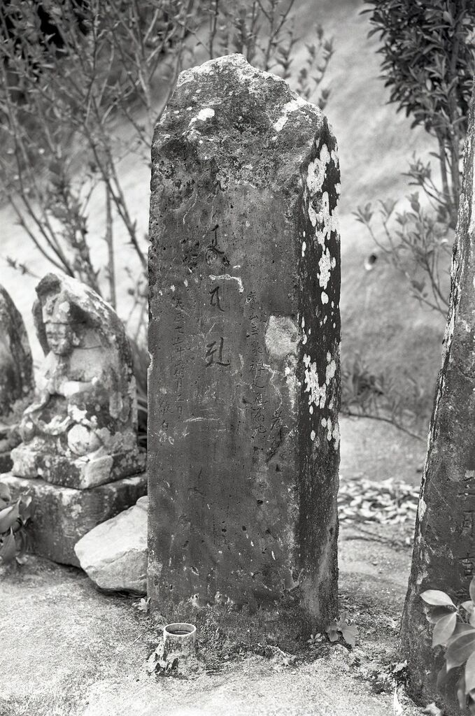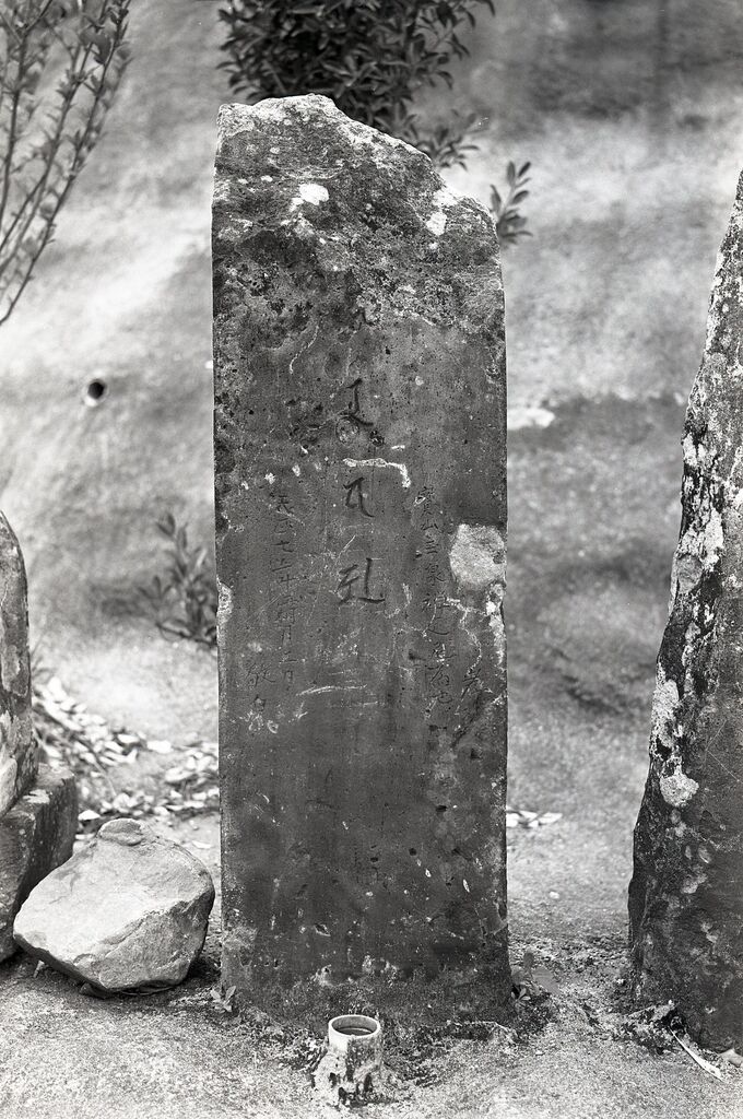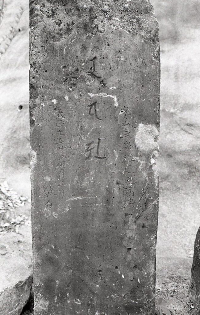 天正七年霜月二日敬白と彫られている。 中央の梵字は、上部を欠失しているため、上一字キャを欠いているが、五輪塔東方発心門の種子で、筆書きで小さく薬研彫りにあらわす。その左右に刻まれた文字は、欠失の一字をのぞいて、肉眼でも明瞭に読み取れる。この銘によれば、寶山玉泉禅定尼のために、その孝子(きょうし)が桃山時代の初め天正七(一五七九)年霜月(陰暦十一月)二日に本碑を造立供養したものと思われる。天正七年は、梵字の書体によく合っている。