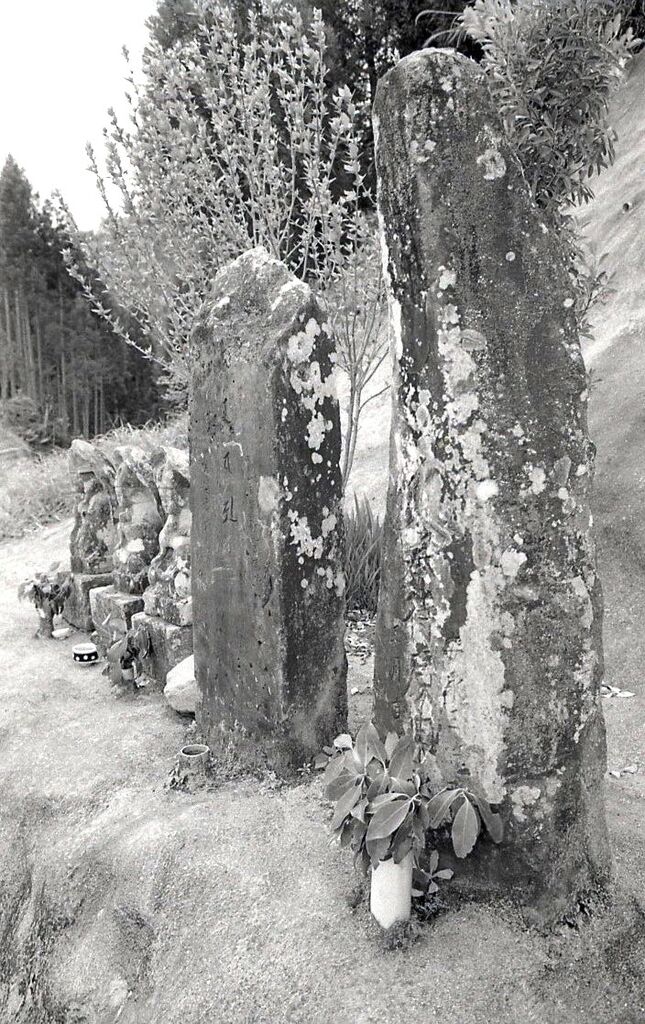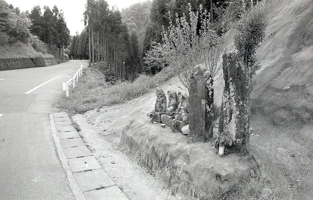 西郷田代から耳川を渡って七㎞余り、和田峠を越えると、すぐ、旧北郷村の中心宇納間に入る。その入口が西野々で、坂の終わり、片側切り通しの斜面を背にして、数基の石造物が並べられている。もとは、旧道沿いに在ったものを、新道造成の際に現在地へ移したものという。