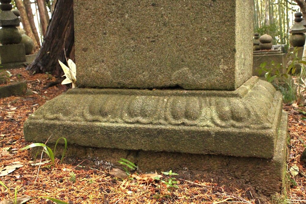 反花座は、下框の側面無地、上に形の良い複弁反花5弁を各辺四方共、明瞭に彫り、上に、地輪幅に合わせた請座を低く作り出す。