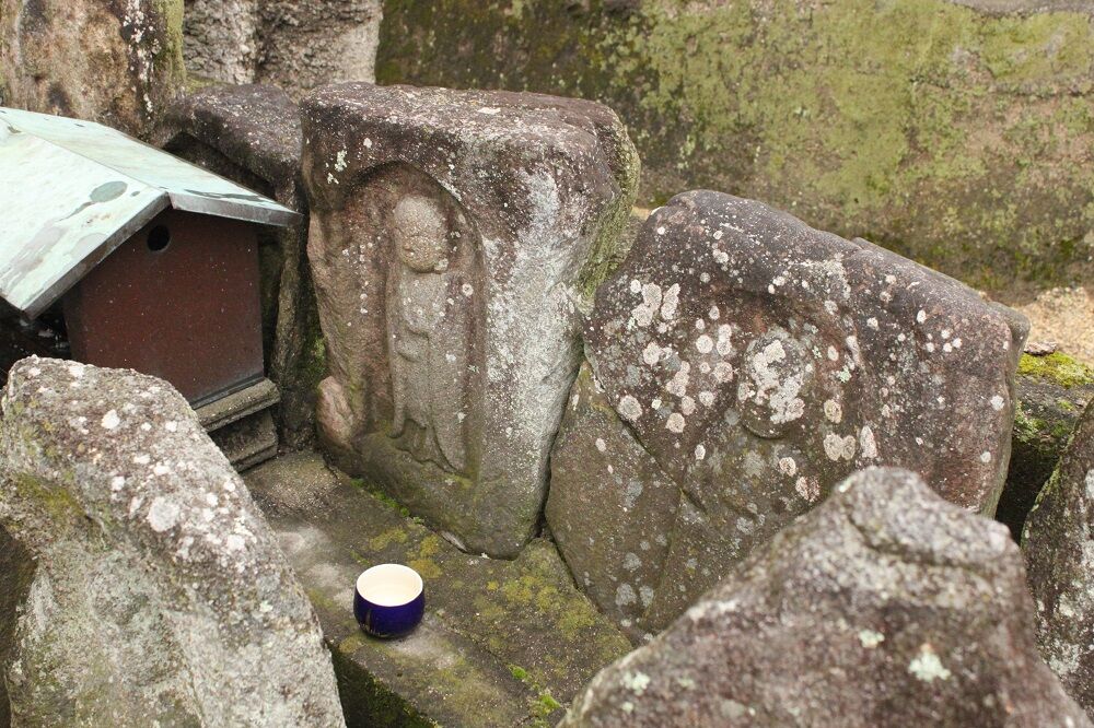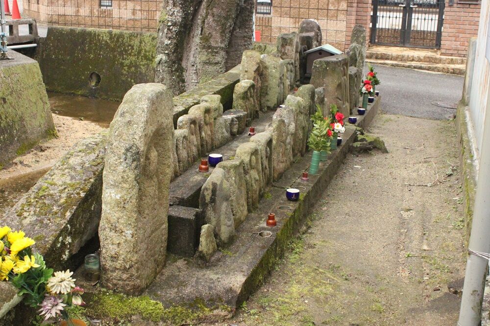 長岳寺五智堂から東方へ、長岳寺方面に少し進むと、道路左側から狭い路地の奥に向かって小石仏群が2列に並べられている。その後列の道路に近い所に有る。