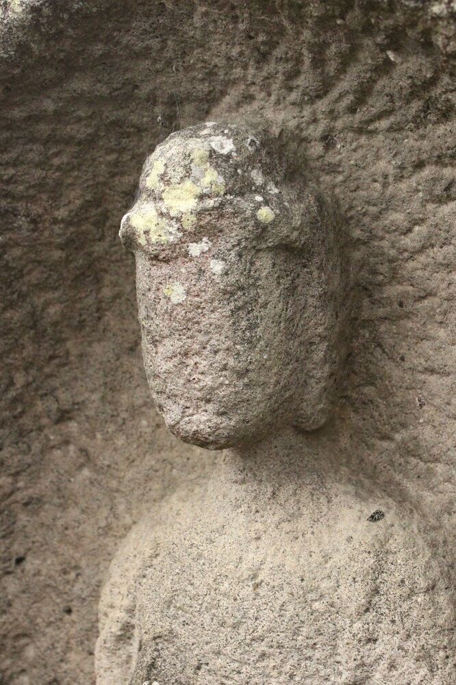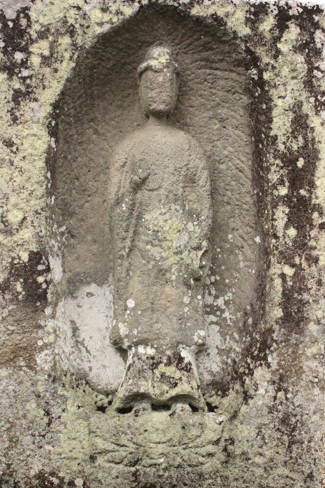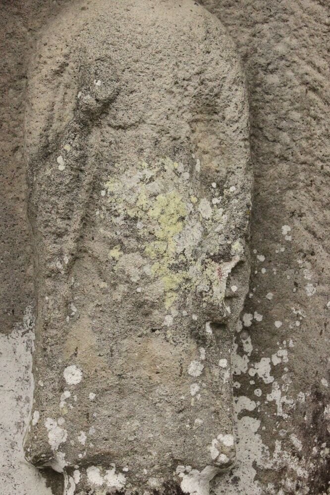 この石棺仏は、古墳に使用された石棺を利用して作られているため、石棺仏と呼称される。無銘ではあるが、同柳本町迎蓮寺毘沙門堂の建治二年銘半肉彫阿弥陀如来立像石棺仏と同一手法で製作され、大きさは異なるが、石仏の像容や龕の彫刻まで酷似しており、同一作者と考えられる。製作時期は、どちらが先か分からないが、その近接した前後であることは間違いない。近似した石仏は、このほかにも見受けられ、迎蓮寺毘沙門堂建治二年銘半肉彫阿弥陀如来立像石棺仏を基準にして、建治二年型石仏と称されている(註1)。
