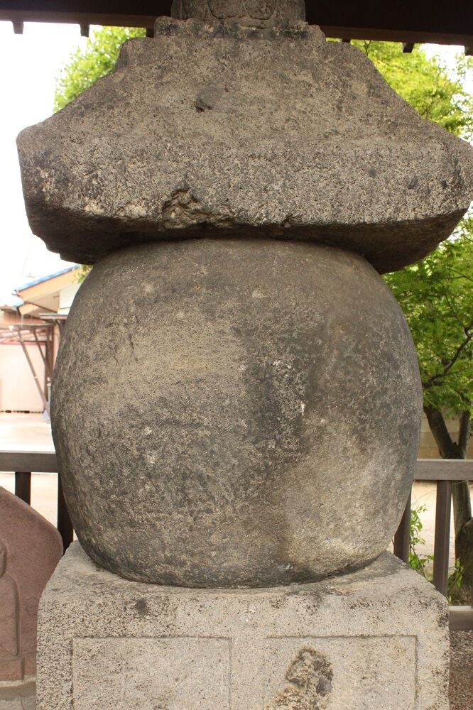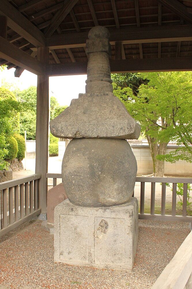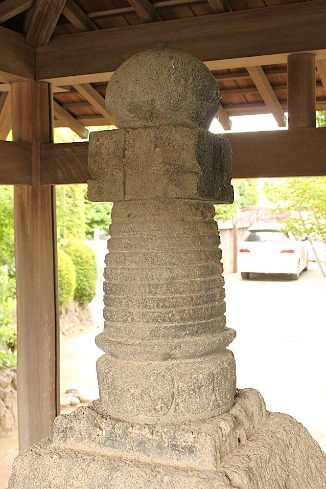 山門を入り、向かって右前方に吹抜きの小堂があり、内に2mを超える石塔が祀られている。