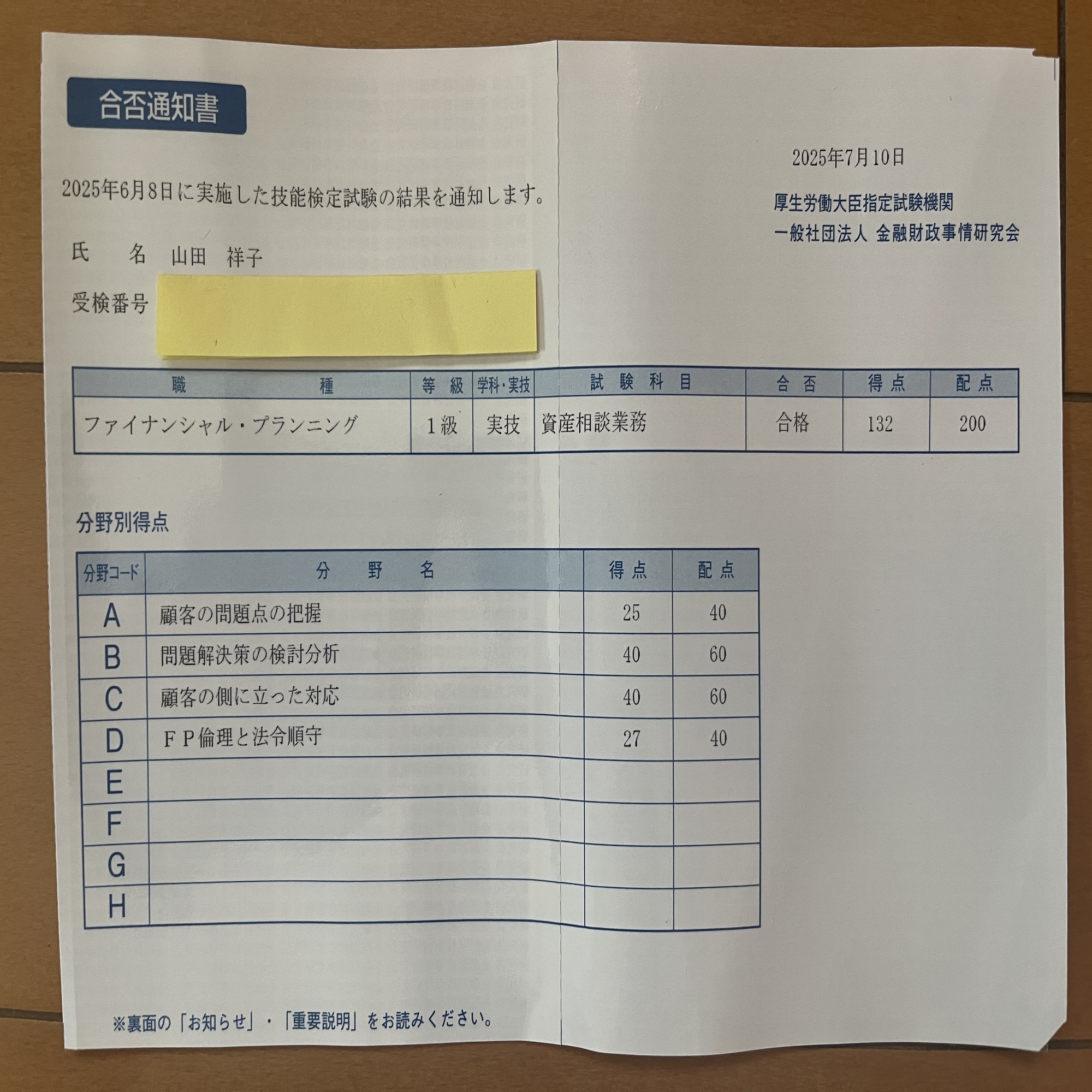 2024年6月のCFP試験で「金融」「ライフ」「リスク」「タックス」を、2024年11月のCFP試験で「相続」「不動産」に合格しました。
