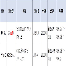 FP1級実務試験には、「きんざい」と「FP協会」の2つがあり、どちらか一方を選択して受験します。上記の比較表の通り「きんざい」の試験は、2月6月9月の年3回開催され、「FP協会は」9月の年1回です。