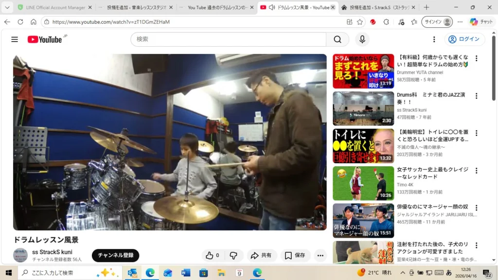 You Tube 過去のドラムレッスンの一部カット 今日は本当に暖かく初夏の陽気ですね!! とても気持ちも良い天気です 本日はYou Tubeで過去のドランレッスン風景の一部です! 当時小学生だったG君も今では大学生 動画は課題曲のフィルインを練習しています!! ↓こちらがリンク先になります!! ドラムレッスン風景