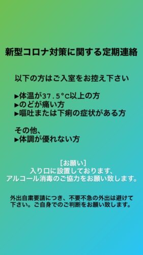 生徒様におかれましてもスタジオ入り口にありますアルコール消毒のご協力をお願いいたします。
