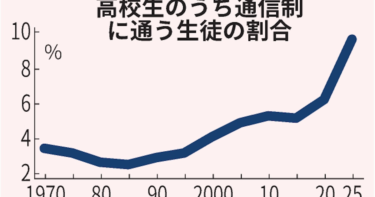 不登校の増加を背景にして、通信制高校の生徒数が急増しています。 その数なんと30万人超え。全体の9.6%と1割近くに達しており、これはもちろん定時制の人数よりも多いです。