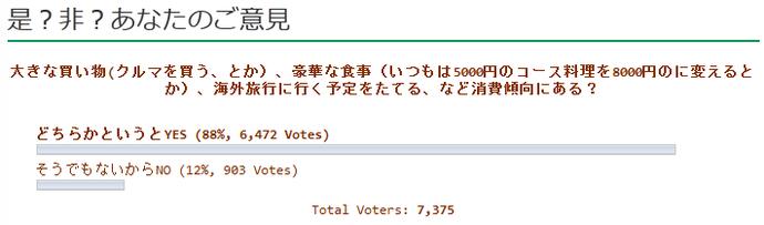 | 民主党の蓮舫参議員議員が公式サイトで行っている消費に関する調査で、開始直後と大きな変化が見られている。 蓮舫氏は公式サイト内の「是?非?あなたのご意見」というコーナーで「大きな買い物(クルマを買う、とか)、 豪華な食事(いつもは5000円のコース料理を8000円のに変えるとか)、 海外旅行に行く予定をたてる、など消費傾向にある?」と聞いた。 10日の段階では「どちらかというとYES」が69票(19%)で、「そうでもないからNO」が300票(81%)となっており、 多くの人が景気の浮揚を実感しておらず消費行動に結びついていないとの結果になっていた。 だが、その後投票数が大幅に伸び、13日15時現在、「どちらかというとYES」が6444票(88%)で、「そうでもないからNO」が900票(12%)で逆転している。この結果を見ると羽振りの良い人が増えているようである。 ソース:http://yukan-news.ameba.jp/20130413-134/ |