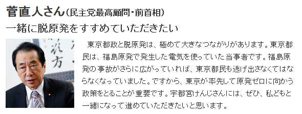 宇都宮けんじ立候補、なんと菅直人から応援の声wwwwwww