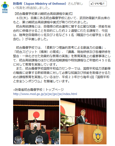 統合幕僚学校の卒業式に韓国旗、幕僚学校・総務課へ電凸