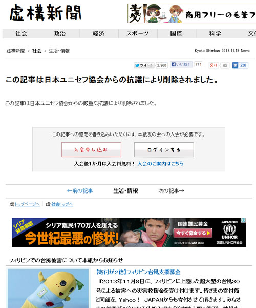 批判されてきた同団体への寄付金について、 来年度から透明化を徹底させると 明らかにした」という内容の記事で、 昭和記念公園に「見えないトイレ」を設置すること などについてのパロディ記事だったのだが、 同日削除され、同記事のURL先には 「この記事は日本ユニセフ協会からの 厳重な抗議により削除されました。」と記載されることになった。 サイトがサイトだけに、「抗議自体がネタなのか?」 とも思われたのだが 『虚構新聞』の公式『Twitter』アカウントである 虚構新聞速報/編集部便り(?@kyoko_np