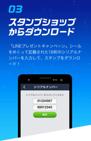 対象商品を購入し、シリアルナンバーを入力して、限定LINEキャラクタースタンプをGETしましょう!