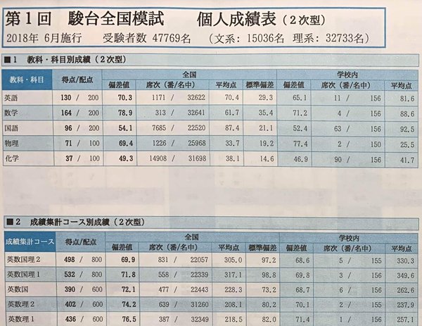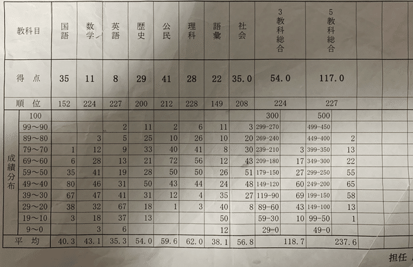 僕の受験生活の始まりは高校一年生の冬でした。理由は単純で中学 1 年生から高校 2 年生まで毎年留年しそうになっていたため、放校されないように勉強しなければならなかったからです。下の成績表が高一冬の校内模試の成績表です。