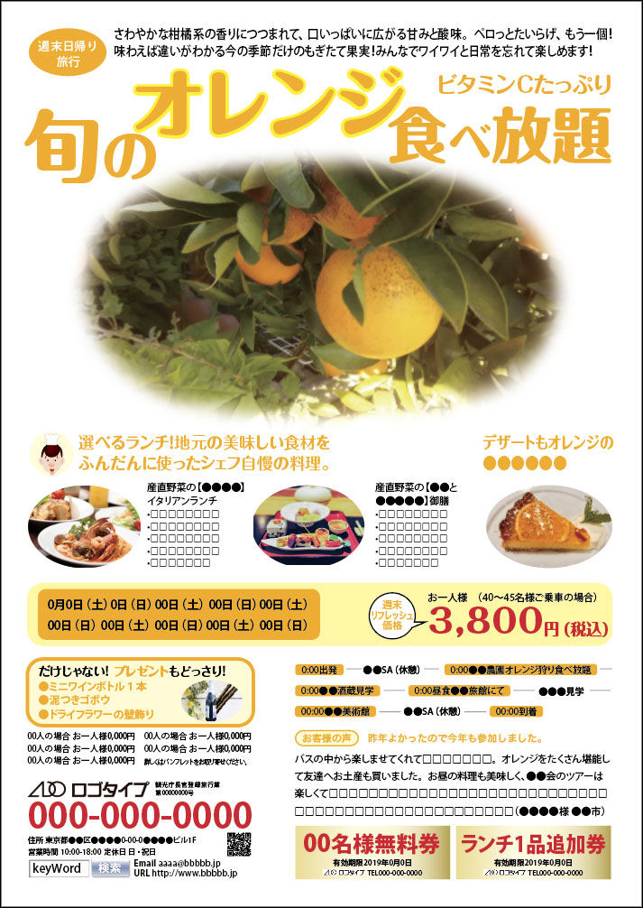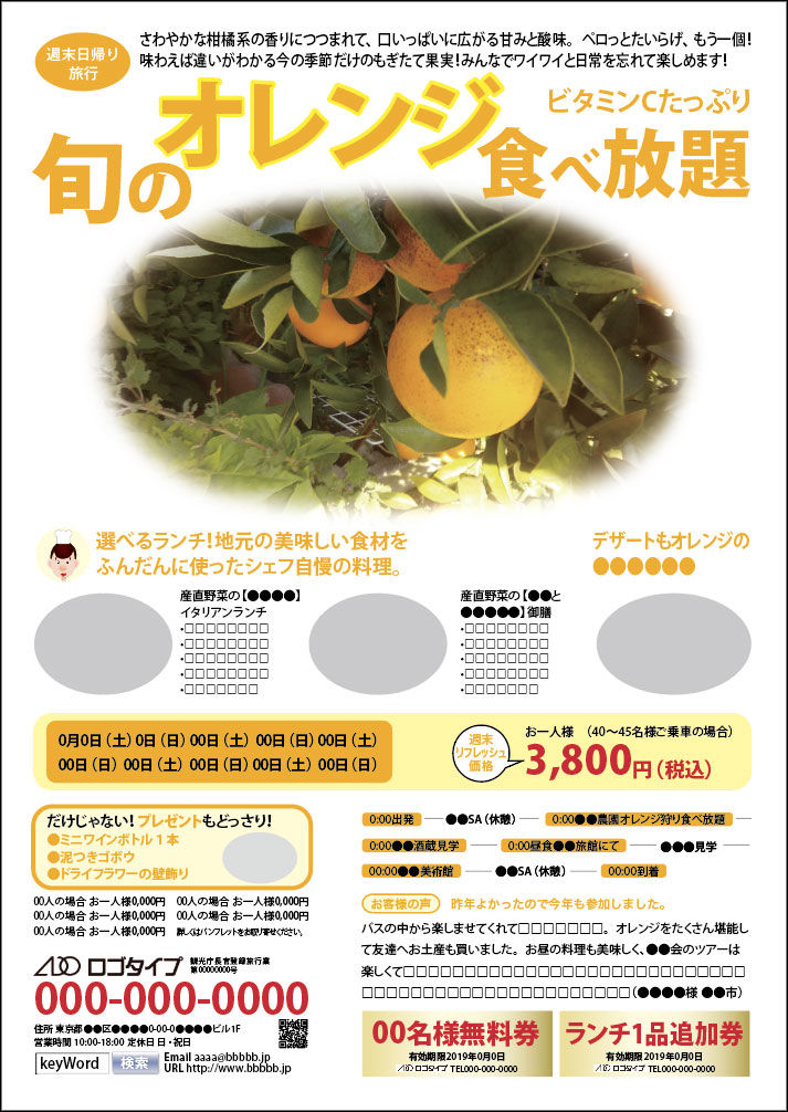 今回の紹介は、日帰りツアーのチラシのテンプレートです。 それぞれ貴社のツアー内容に合わせてアレンジください。