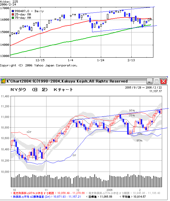 上段の日経225と下段のNYダウの日足のチャートにトレンドラインを引いてみました。こう考えると、NYダウは日経よりもやや先行していると考えられます。NYダウは現在上値抵抗線付近でもみ合っていると考えられ来週からの下落が予想されます。
