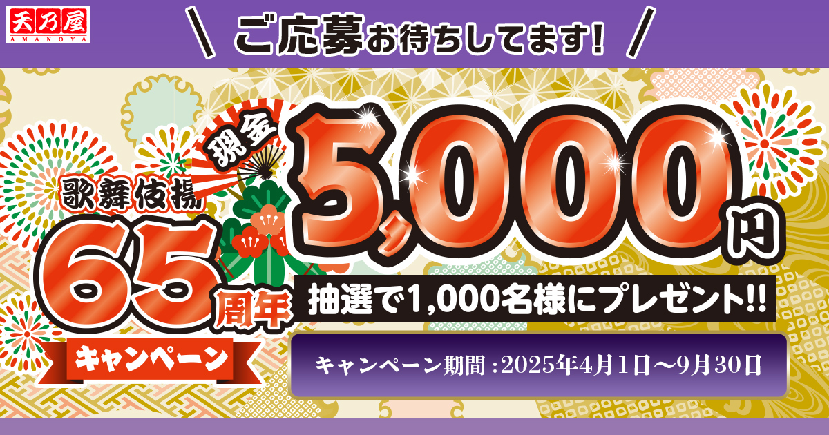 歌舞伎揚65周年キャンペーン:現金5000円プレゼント|天乃屋皆さまにご愛好いただきおかげ様で歌舞伎揚65周年。現金5,000円が当たるキャンペーン実施中。対象商品のバーコード2枚を貼って応募しよう。www.e-amanoya.co.jp