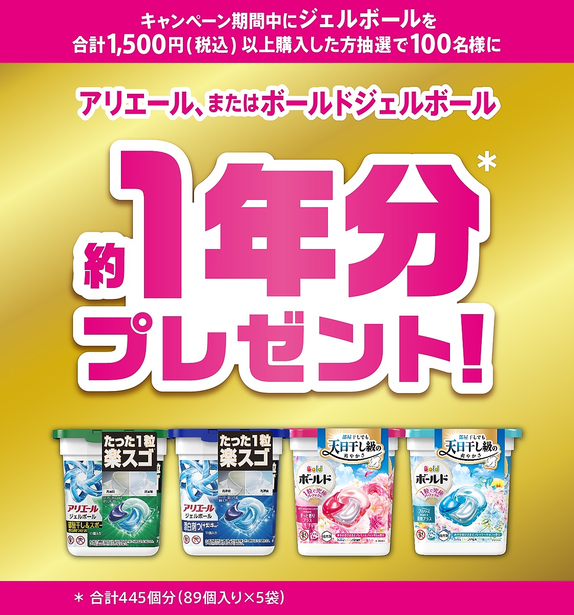 抽選で100名様にジェルボール約1年分プレゼント!キャンペーン【応募締切】2026年4月7日(火) まで!1回のお会計で合計1,500円(税込)以上購入すると、抽選で100名様にアリエール、またはボールドジェルボール 約1年分*プレゼント!*合計445個分(89個入り×5袋)。www.pgjapanbrands.com
