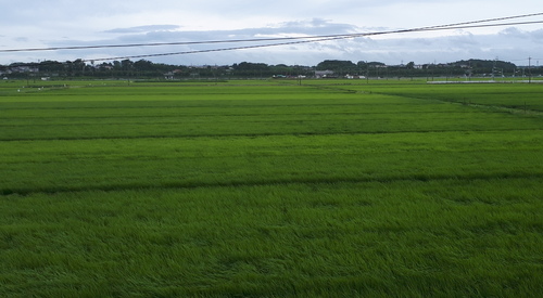 家の前では風が勢い良く吹き、田んぼの稲を揺らして風が生き物のように