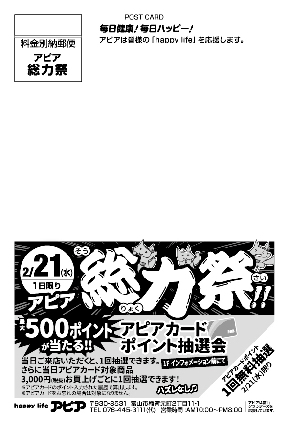 2/21(水)にアピア全館お買い得セール「アピア総力祭」を開催します! | アピアショッピングセンター2/21(水)にアピア全館お買い得セール「アピア総力祭」を開催します。 また、最大500ポイントが当たるアピアwww.apa.gr.jp
