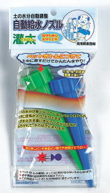 空きペットボトルの先に「自動給水ノズル」を付け、鉢に差し込めば、水が少しずつ土に染み込みます。これで、去年は大丈夫でした。