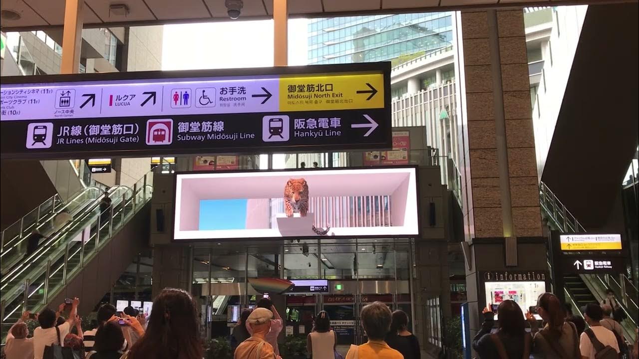 さて、タイトルの件ですが、JR大阪駅の中央改札からグランフロントへ繋がる長〜〜〜いエスカレーターの上(?)に大型TVがあるのをご存知でしょうか?