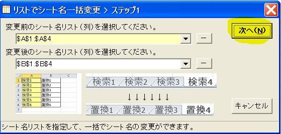 2.B列に既存シート名に対する変更後のシート名を入力します。